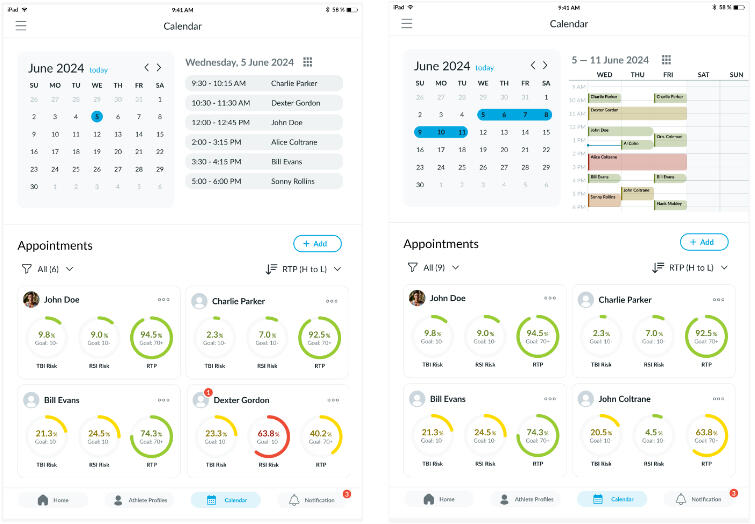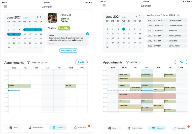 We wanted to offer different ways to view the calendar which would easily reflect information that ATs are interested in. This includes the ability to see appointments