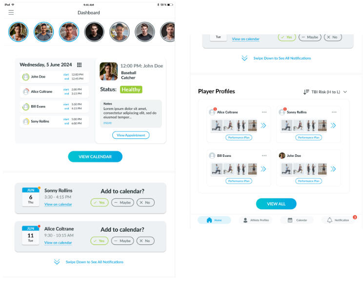 clearly and quickly present any upcoming appointments. Additionally, we provided the ability to access player profiles directly from the calendar and important notifications